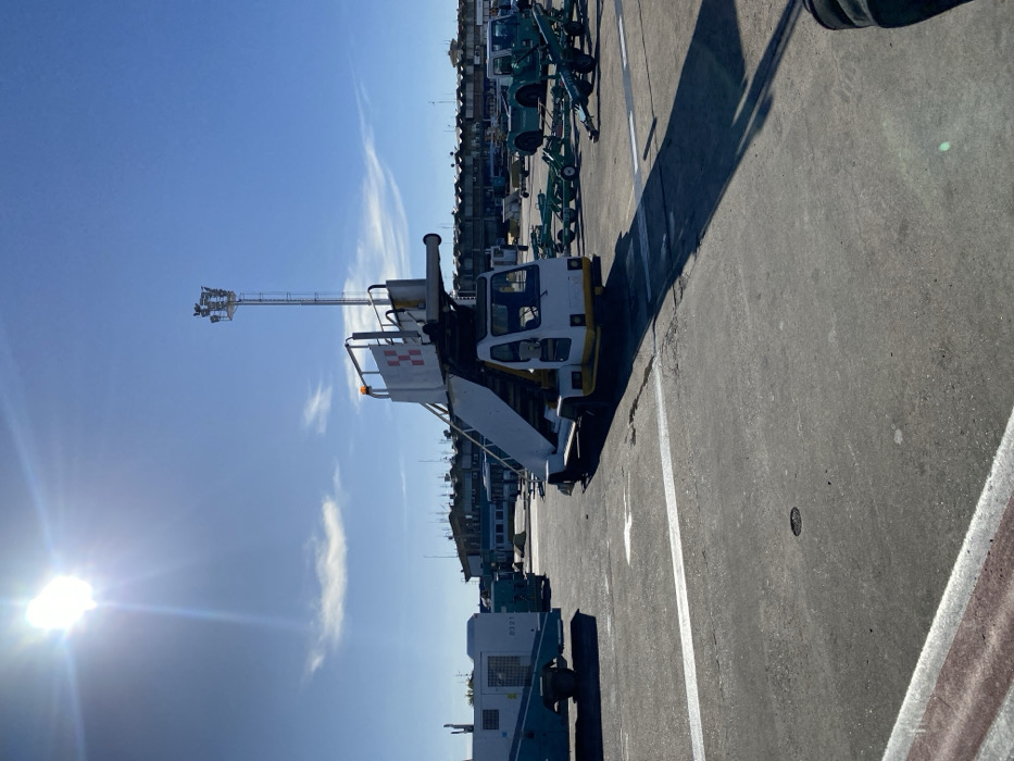 An airport tarmac features a white, self-propelled passenger boarding stairs vehicle with yellow trim. The vehicle has an adjustable ramp and safety railings. A retractable tower with lights extends above. A line of assorted airport vehicles is parked in the background. The sun shines brightly in the sky, partially obscured by a few clouds. Shadows stretch across the concrete surface.