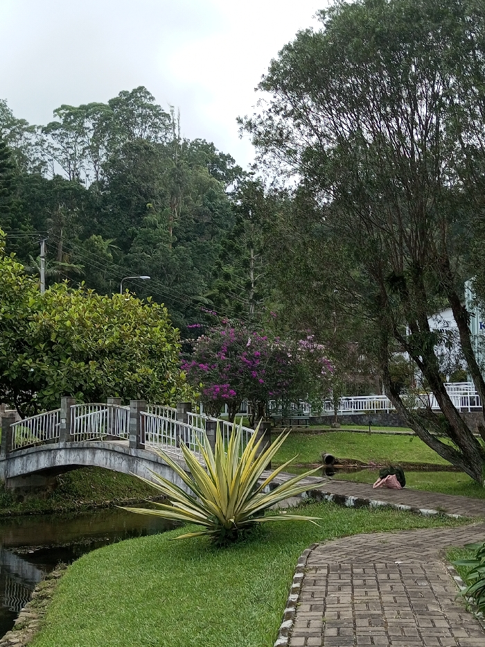 An outdoor scene in Ambositra, Madagascar, depicts a park-like environment under an overcast sky. In the foreground, a prominent spiky plant with variegated yellow and green leaves grows from a patch of manicured green grass. To its right, a brick-paved path curves slightly, extending into the midground. A small, arching concrete bridge with white metal railings crosses a narrow, dark body of water directly behind the foreground plant and to the left of the path. In the midground, beyond the bridge and to the right of the path, two individuals are present on the grass near the water's edge. One person, wearing a dark top and lighter pants, is lying face down on the grass. Another individual, dressed in a pink top and dark bottoms, appears to be positioned close to or leaning over the first person. A dark pipe is partially submerged in the water near these individuals. The background features dense vegetation. To the left, a vibrant green tree canopy rises, with power lines and a street light visible within it. Behind the bridge, a large bush with purple flowers adds a splash of color. Further right, a tall tree with dark bark and slender branches partially obscures a white building with white railings. A picnic table is visible in the distance behind the purple-flowered bush. The far background is dominated by a densely forested hillside under the light grey sky.