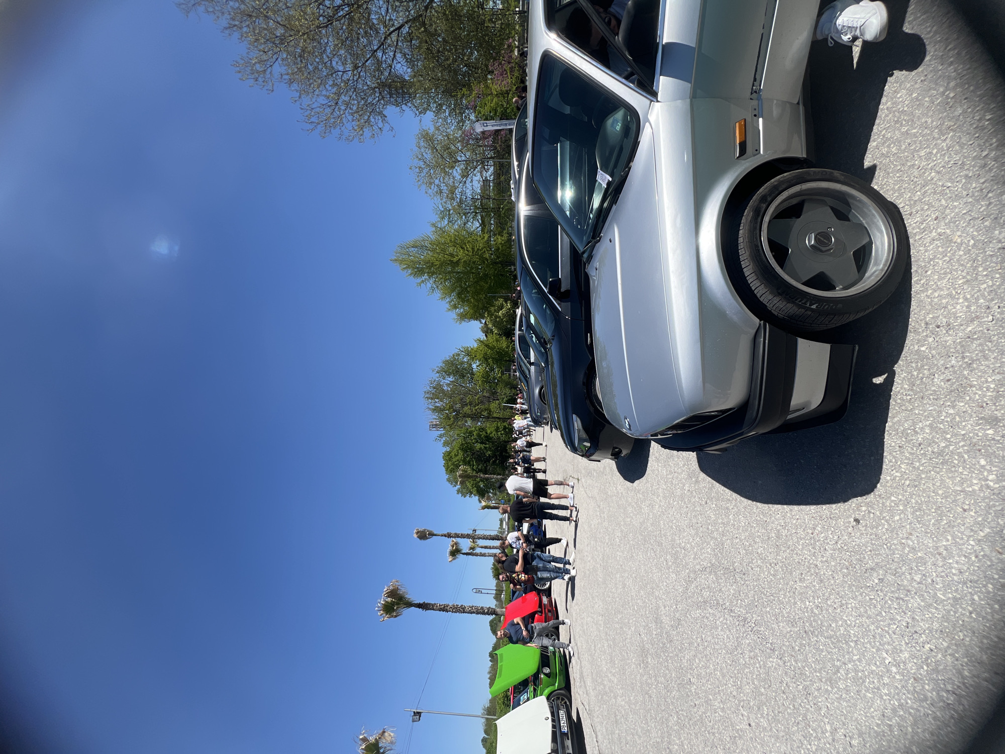 row of cars parked on an asphalt surface, with a crowd of people standing around. The sky is clear and blue. In the background, there are trees and palm trees. The location is the city of Plovdiv, Bulgaria. The foreground features a silver car with a distinctive five-spoke wheel. Several other cars are parked behind it, including a black car and a green car. People are interacting in groups near the cars.