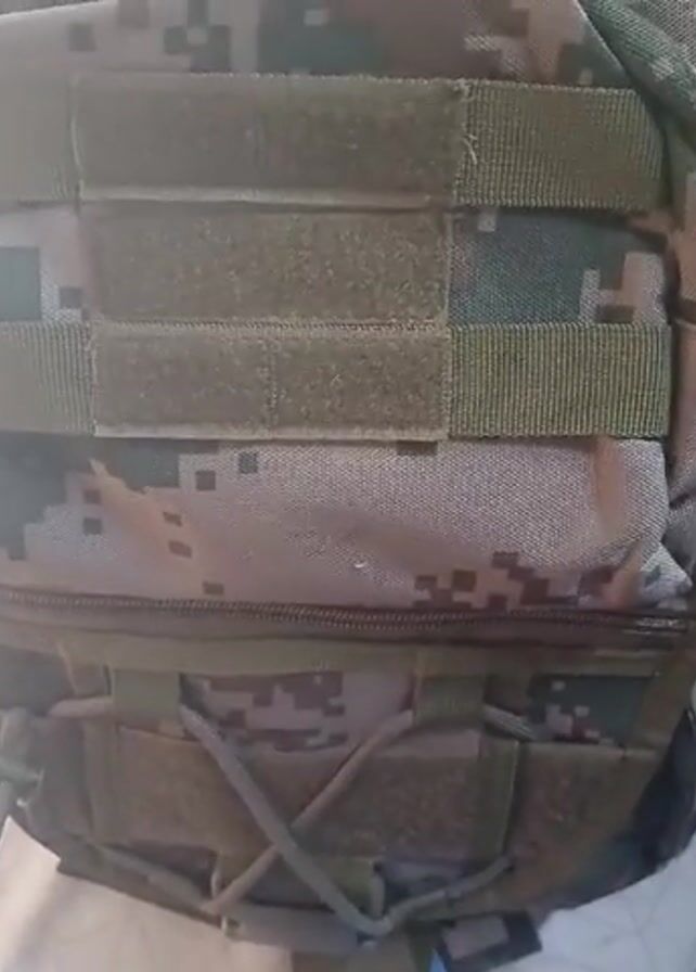military-style tactical backpack with a digital camouflage pattern. It has several MOLLE webbing straps on the front, a zippered compartment at the bottom, and a crisscrossed bungee cord. The backpack is likely sitting on a table or other flat surface, and there's a hint of a blue object in the background. The video seems to be taken indoors.