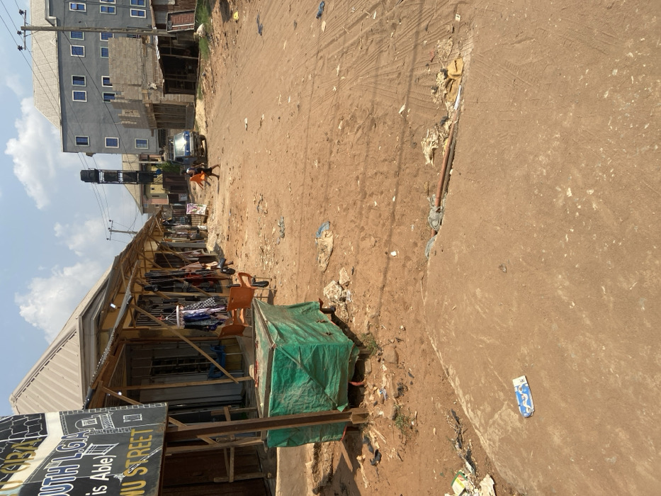 The image depicts a street scene in Orifite, Nigeria, specifically on Umuakaanu Street, as indicated by a partially visible sign on the left. The foreground and midground are dominated by an unpaved, reddish-brown dirt road, heavily marked with vehicle tire tracks and scattered with various pieces of litter including plastic packaging, fabric scraps, and general debris. On the immediate left, a rectangular object covered by a green tarp rests on wooden supports. Adjoining this, a row of single-story market stalls with corrugated metal roofs extends down the left side of the street. These structures feature exposed wooden frameworks supporting awnings, under which clothing and fabric items are displayed. Two orange plastic chairs are visible outside one of these shops, and a person is seated on a bench or chair further along the row. On the right side of the foreground, a section of reddish-brown concrete abuts the dirt road, containing a discarded blue and white wrapper. In the midground, two individuals, one wearing an orange shirt, are walking or running from left to right across the dirt road. A light blue utility truck is parked on the right shoulder of the road, facing away from the viewer. In the background, a multi-story grey building with multiple blue-framed windows stands on the right, appearing to be under construction or recently completed. A tall, slender structure, possibly a water tower, with a black tank at its apex, is visible in the distance beyond the truck. Utility poles with overhead power lines line the street. The sky is clear and bright blue with minimal cloud cover, indicating daylight conditions.