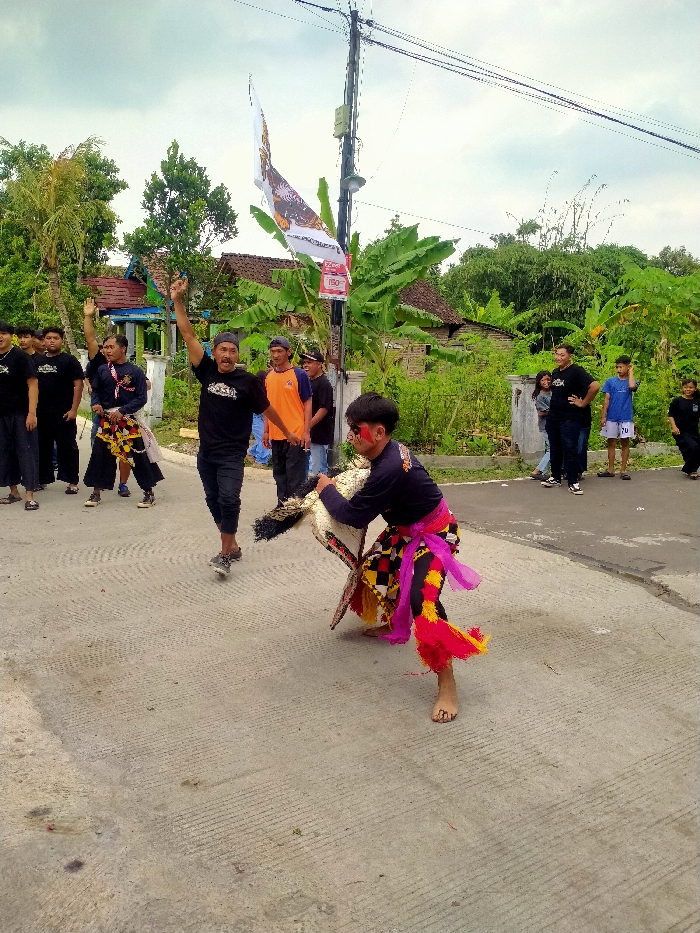 A street scene shows a group of people gathered for a performance. A young dancer in traditional attire, with painted face and colorful accents, holds a decorative piece. An adult in black raises a hand in encouragement. Other individuals watch from the roadside, some in matching black shirts. A flag and utility pole are visible in the background, adding to the setting of a community event.