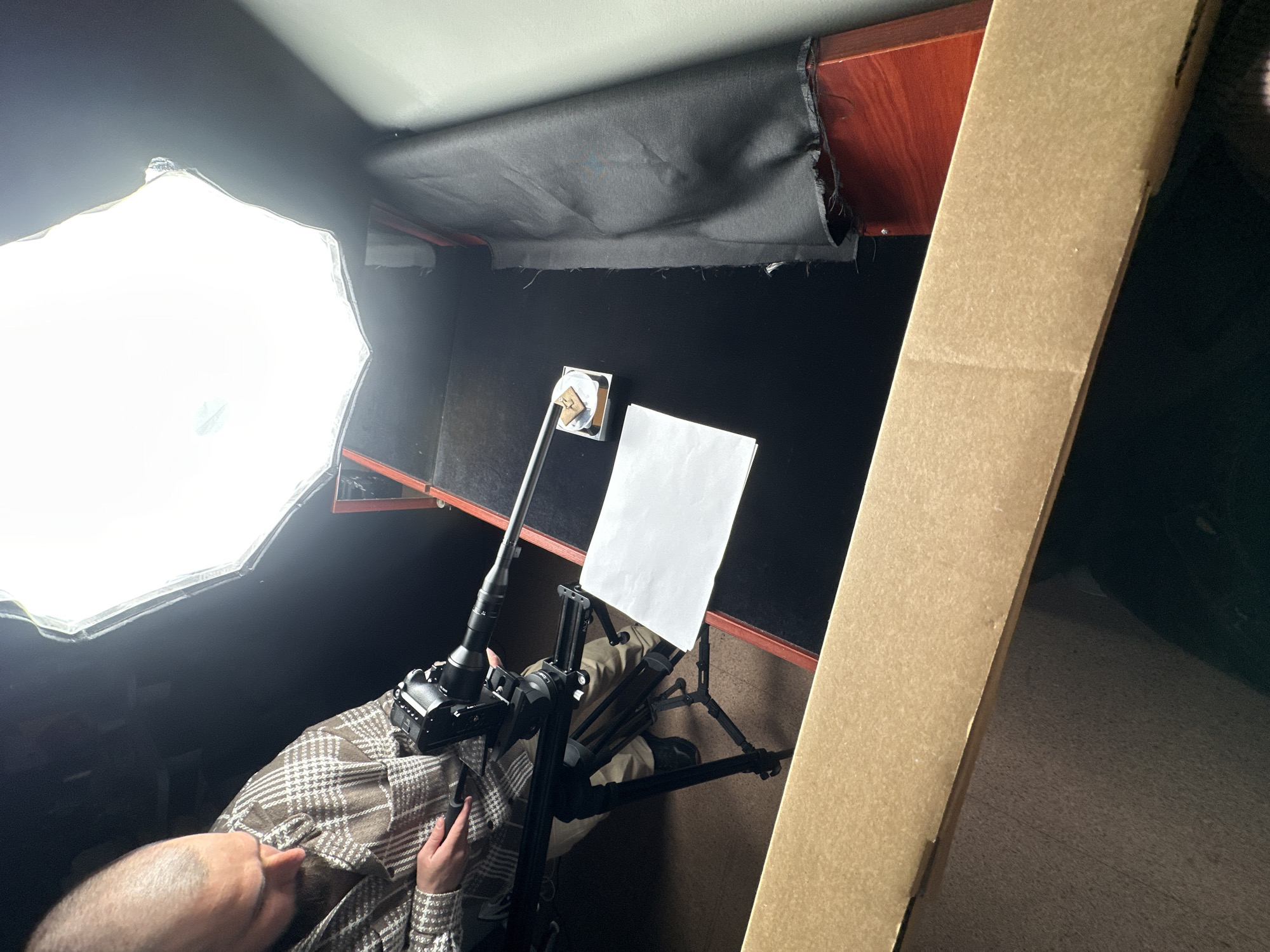 The image depicts a makeshift photography setup indoors. A person wearing a plaid shirt and khaki pants is operating a digital camera mounted on a tripod. The camera is positioned in front of a small product photography studio constructed within a dark space. There's a bright softbox light to the left of the camera, illuminating the studio. Inside the studio, there is a white reflector board and a small product positioned in front of a black backdrop. A cardboard panel is seen on the right side of the frame, partially obstructing the view. The image was taken at a location in the city of Pisochyn, Ukraine.