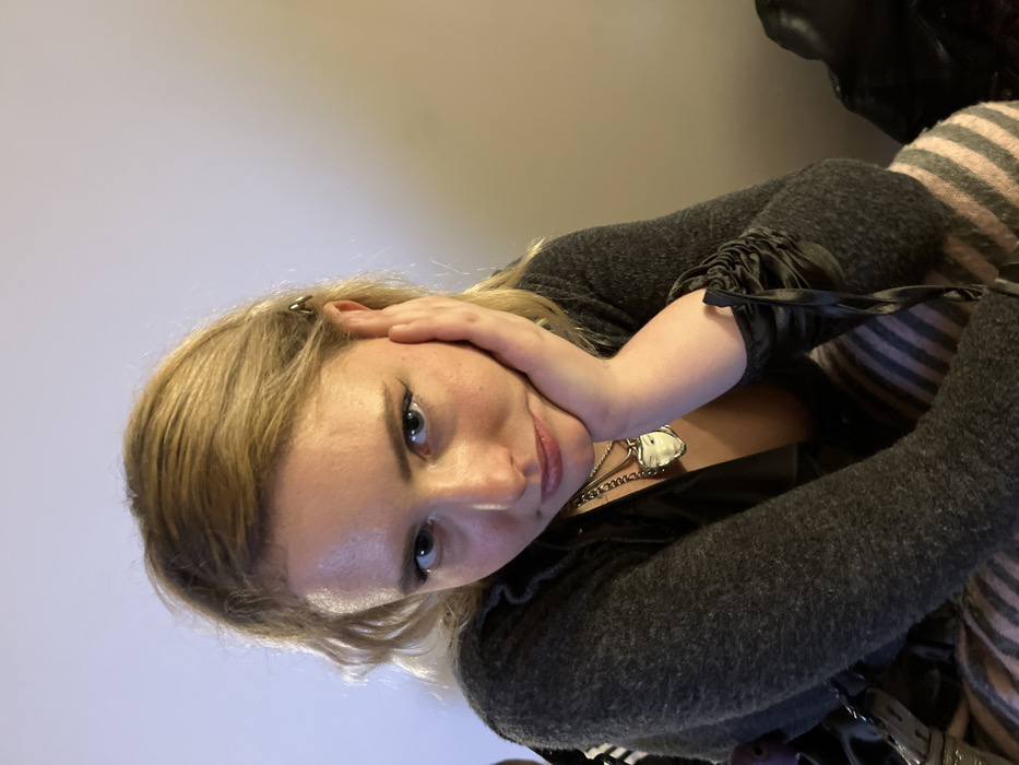 The image presents a close-up indoor portrait of a light-skinned female individual