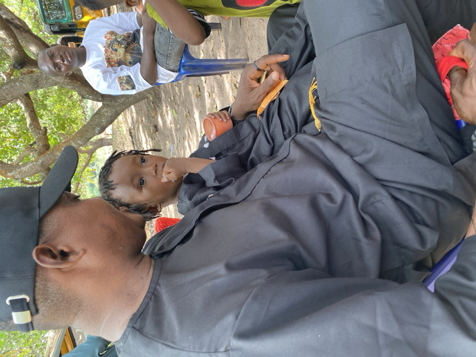 An adult male wearing a black baseball cap and a black traditional tunic is seated on the left, looking towards a young child positioned on his lap or directly beside him. The child, with braided hair, is dressed in a black garment similar to the adult's, holding a small orange cup in their left hand and placing their right hand near their mouth. The adult's right hand rests on his leg, holding a yellow tassel-like object. In the mid-ground, to the right of the primary subjects, another adult male is seated on a blue plastic stool. He wears a white t-shirt with a multi-figure graphic print and light-colored jeans. A portion of a yellow and green auto-rickshaw is visible behind him. The scene is outdoors in Ochadam, Nigeria, characterized by dappled sunlight filtering through overhead tree foliage onto a bare earth ground.