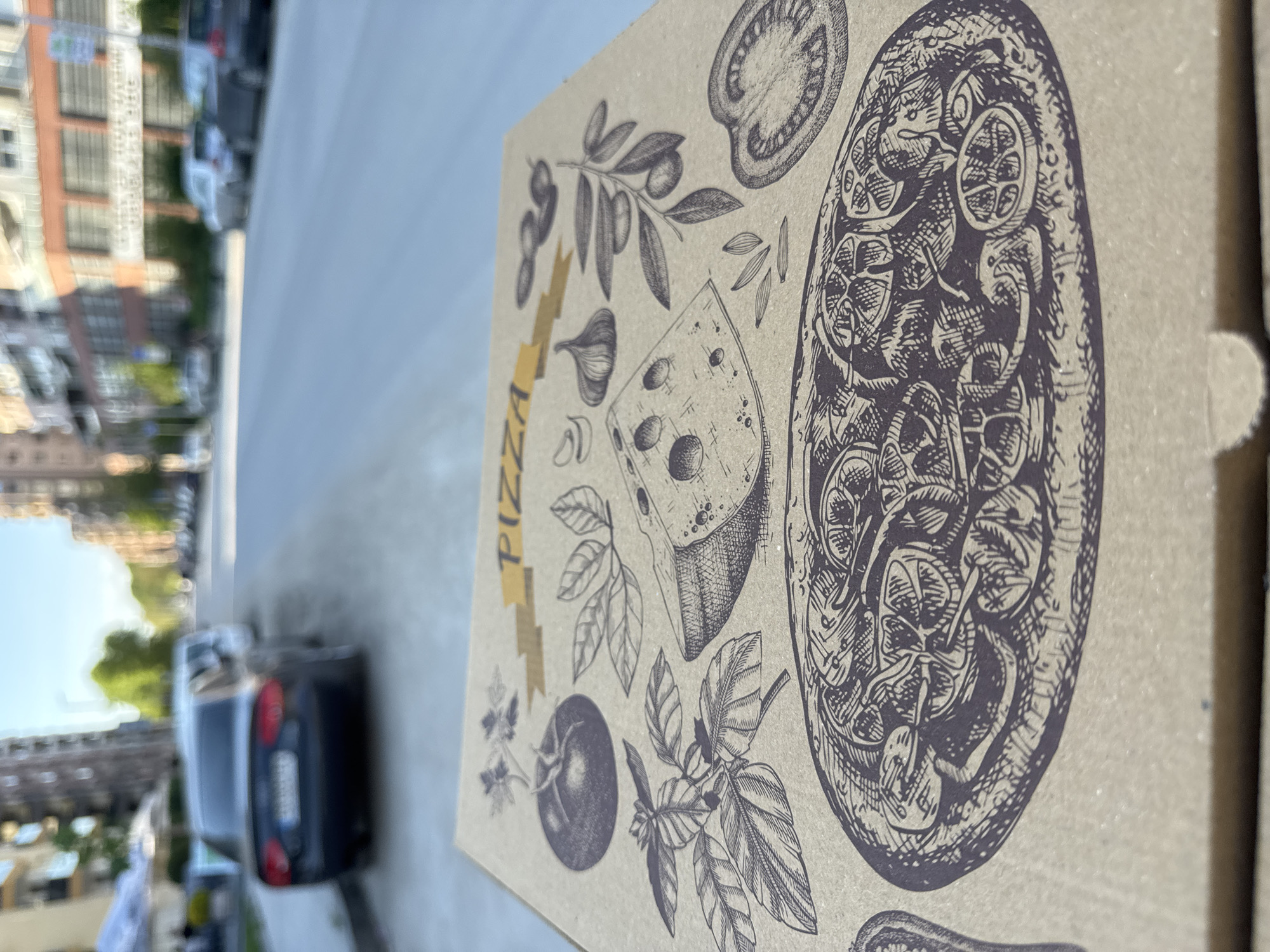 pizza box with drawings of pizza ingredients (tomatoes, cheese, olives, basil) and the word "PIZZA" on a ribbon. The box is placed on a surface with a view of what appears to be a cityscape. In the background, there are buildings, possibly in Plovdiv, Bulgaria, and some vehicles can be seen parked on the street. The perspective suggests the image was taken from a higher vantage point, such as a balcony or window.