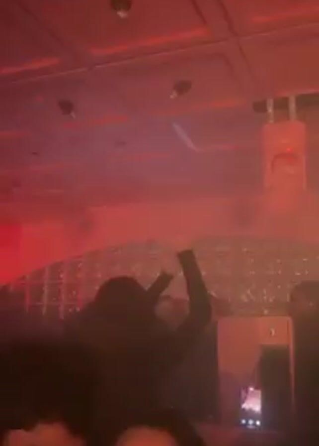 crowded, dimly lit indoor venue, possibly a nightclub or a party. The lighting shifts between red and purple hues, with spotlights shining down on the crowd. Several people are visible, some with their faces partially obscured. A person in the center appears to be dancing with their arms raised, while others are holding up phones, possibly recording the event. The background features what seems to be a mirrored or reflective surface and some equipment. The atmosphere appears energetic and lively.