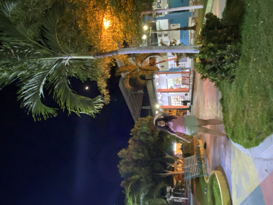 The image displays a nighttime scene within a public plaza in General Villamil Playas, Ecuador. A female individual stands in the foreground, slightly left of center, positioned on a multi-colored paved pathway with sections of yellow, blue, pink, and gray. She has dark, wavy hair and wears a light pink short-sleeved top and light green shorts; her right hand is raised near her head. The background features a two-story building appearing commercial, brightly illuminated with internal white lights and exterior accents. Its ground floor exhibits a white facade with vertical orange elements, large display windows showing merchandise, and two red slatted metal benches positioned outside. To the far right, a blue building with white trim is partially visible, displaying the text "PLA." The environment includes numerous trees, with a prominent palm tree in the mid-right foreground and additional palm trees and deciduous trees with green foliage throughout. Artificial lighting, primarily from streetlights, casts a warm yellow-orange glow on much of the foliage and the ground. Patches of green grass and dense shrubbery are present in the foreground and mid-ground, including a specific shrub with small red accents in the lower right. A light blue slatted metal bench is located in the mid-ground to the left of the central figure. A crescent moon is visible in the dark night sky in the upper center-right. Small, indistinct figures are discernible within the illuminated background building.