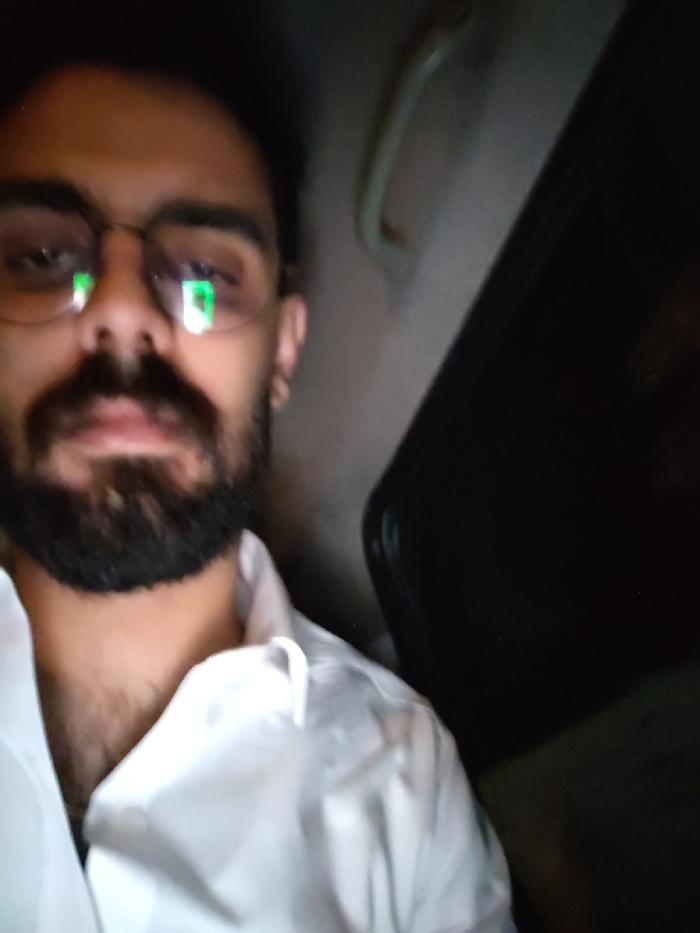 A low-light selfie captured within a vehicle interior in Al-Qaboun Municipality, Syria, shows a male subject. The individual, presenting with dark hair and a full dark beard, is wearing round-framed eyeglasses, which exhibit distinct green light reflections on both lenses. He is dressed in a white collared shirt, unbuttoned at the neckline, revealing chest hair. The immediate environment consists of a light-colored vehicle ceiling with a grab handle visible in the upper right portion of the frame. The area to the subject's right is largely obscured by shadow, indicative of a dark interior panel or seat. No additional individuals or explicit interactions are discernible.