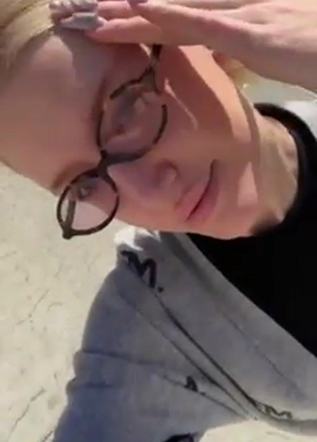 A young woman with fair skin and blond hair is filming a selfie video outdoors. She is wearing glasses with tortoiseshell frames, a black shirt, and a light gray cardigan with writing on the sleeve. She is standing on a light-colored paved surface and looking at the camera. She briefly touches her hair with her fingers. Behind her, there is a building under construction, with blue sky and bright sunlight visible. The camera is held at an angle, providing a slightly tilted view of the scene.