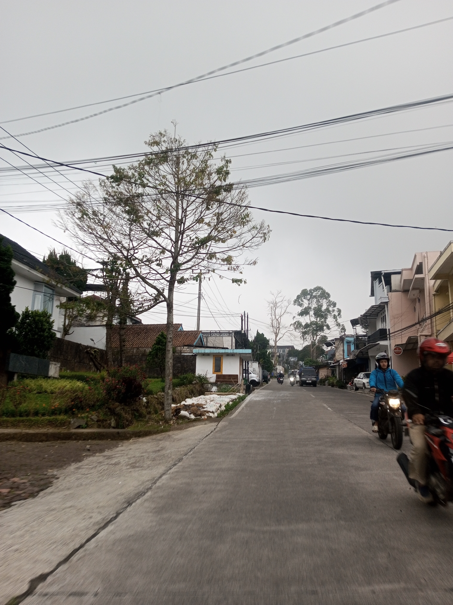 This image depicts a street scene in Kan Beit, Myanmar, under an overcast, light grey sky. A grey, paved road extends through the center, showing a slight curve and gentle incline. On the left, an unpaved shoulder borders a raised grassy area with green foliage, leading to multi-story buildings with white facades and dark roofs. A tall, sparsely leafed tree stands prominently on the left side of the road, with other trees and utility poles visible further back. On the right side, a row of two-to-three-story buildings, painted in various light tones including pink and blue, line the street. Numerous dark overhead power lines crisscross the upper portion of the frame. In the immediate foreground on the right, two motorcycles are in motion. The first rider, partially visible, wears a red helmet and dark attire. The second rider, positioned slightly behind and to the left, wears a blue jacket and a dark helmet, with the motorcycle's headlight illuminated. Further down the road, additional motorcycles and at least one dark-colored car are visible in the distance, indicating ongoing traffic.