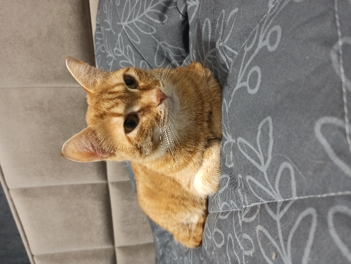 - "An indoor scene depicts an adult ginger tabby cat resting on a bed" by FM-5QedD3, licensed under CC BY 4.0