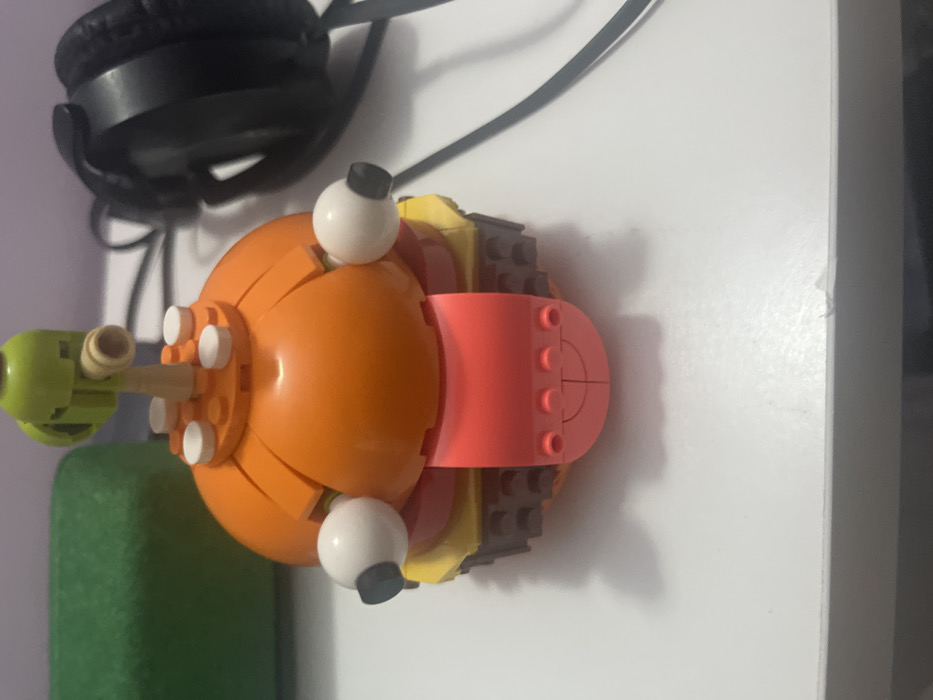 The image displays a custom-constructed Lego model positioned centrally on a flat, white surface. The model is a stylized, anthropomorphic representation of a hamburger. It features a prominent orange hemispherical top section, resembling a bun. Affixed to the apex of this orange piece is a lime-green vertical Lego assembly, resembling a plant stem or a projectile launcher, topped by a tan cylindrical element and surrounded by four white studs. Bilateral white spherical elements with black circular centers, functioning as eyes, are attached to the sides of the orange hemisphere. Beneath the orange section, a red Lego layer and a yellow Lego layer are visible, situated above a base constructed from brown Lego bricks. A coral-red, curved Lego piece extends forward and downwards from the mid-section, displaying an embossed pattern suggestive of a mouth or tongue. In the out-of-focus background, a dark green rectangular object is partially visible on the left. A pair of black over-ear headphones with associated cabling are situated on the right, resting on the white surface. The white surface exhibits minor surface imperfections. No human subjects are present. The specific geographic location within Gosnells, Australia, cannot be ascertained from the visual evidence provided.
