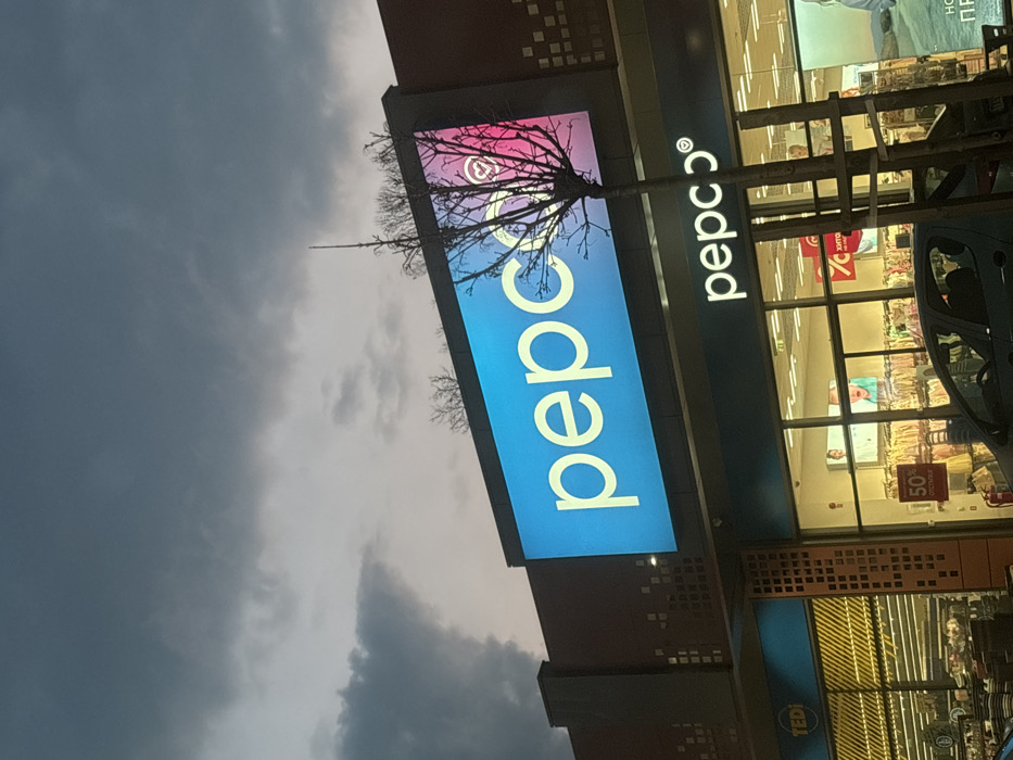 An external, eye-level photograph depicts the facade of a commercial building, likely a retail park or shopping center, under a heavily overcast, darkening sky. The prominent subject is a "Pepco" store, identified by a large, illuminated sign displaying "pepco" in light blue lettering on a bright blue background, situated above the storefront. A smaller, illuminated "pepco" sign is affixed directly above the store's entrance, which features extensive glass windows. Through these windows, various clothing items, including babywear, are visible, along with internal store lighting and promotional signage, notably a partially visible "50% отстъпка" (50% discount) sign in red and white. To the left of the Pepco store, an adjacent "TEDI" store is partially visible, distinguished by its illuminated "TEDI" sign and a yellow-and-black striped interior design seen through its windows. The building's architecture includes dark-toned paneling with a patterned, possibly perforated, square design. A bare-branched deciduous tree stands in the foreground, partially obscuring the Pepco signage and storefront. Additional bare tree branches are visible above the main Pepco sign against the sky. A dark-colored passenger vehicle, possibly a hatchback, is parked in front of the Pepco store, with only its roof and upper body visible. The scene is illuminated by the artificial lights of the storefronts against the dim natural light of the twilight sky. The location is in the city of Dobrich, Bulgaria. No active human subjects or interactions are discernibly captured.
