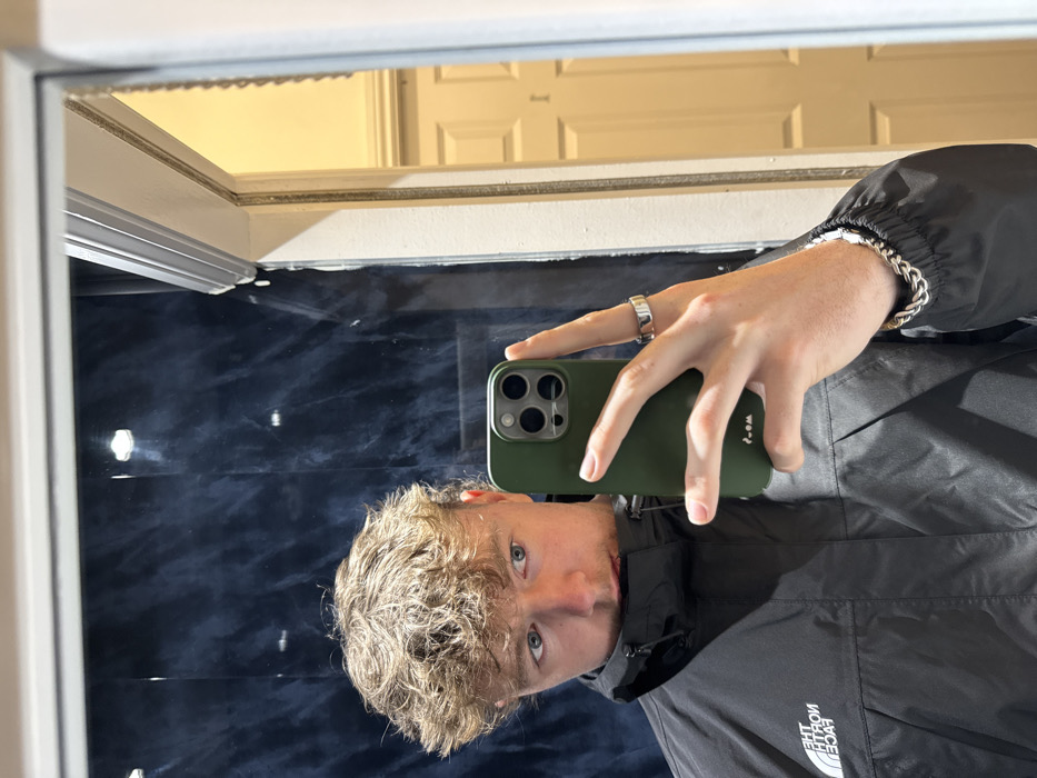 A young male is depicted in a mirror selfie, holding a dark green smartphone, likely an iPhone, in his left hand