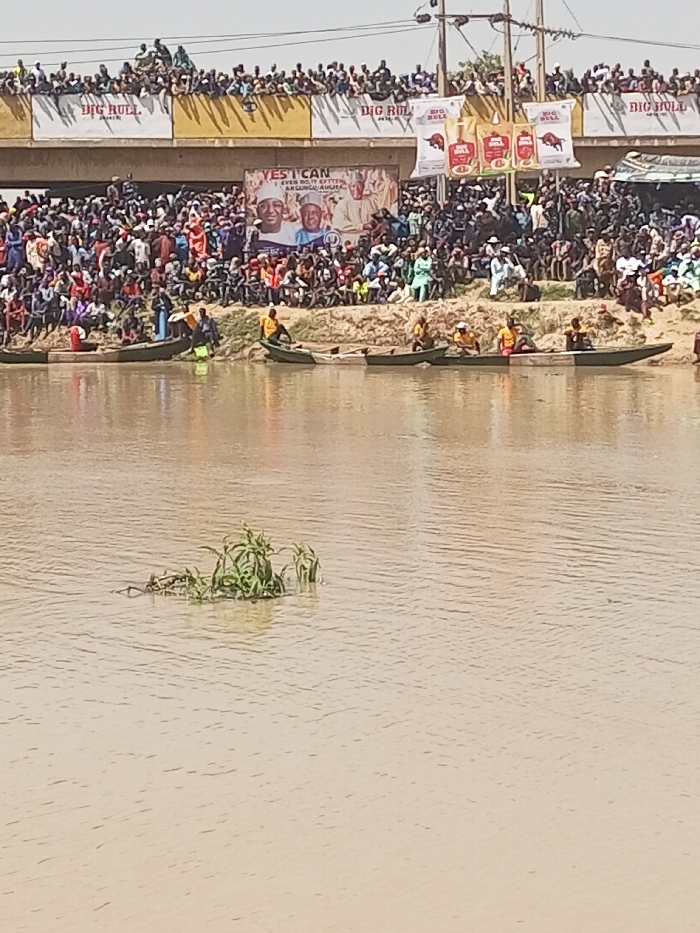 A wide river view captures several boats near the shore, each holding multiple people. Large crowds fill the background, packed on both the ground and an overpass. Banners advertising "BIG BULL" are visible on the overpass. A large political sign featuring two men is displayed among the crowds. Sparse aquatic vegetation rises from the river's surface in the foreground. The scene is bathed in bright daylight.