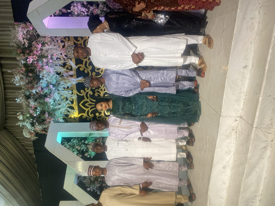 A group of seven people pose for a photo at an event with ornate decorations. The individuals are dressed in a variety of traditional garments, with some wearing white, others in shades of purple, and one woman in a green embellished dress. The backdrop features floral arrangements and ornate patterned designs. All the individuals are looking towards the camera.