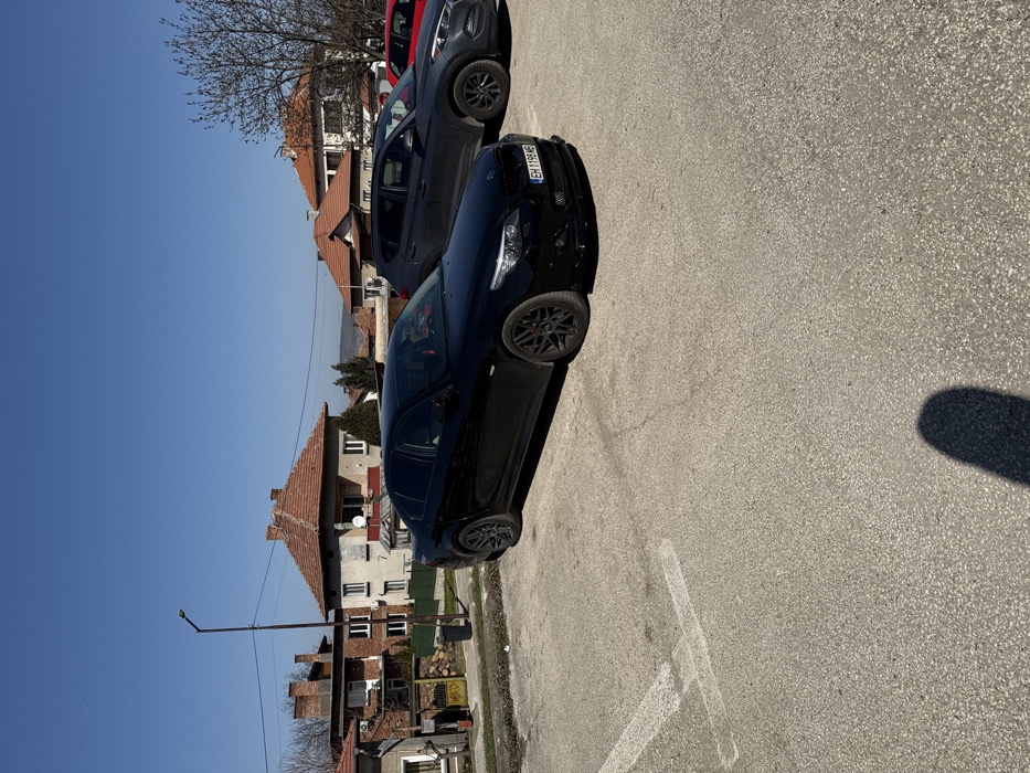 The image depicts an outdoor scene in Cherven Bryag, Bulgaria, on a clear, sunny day. In the foreground, a dark gray asphalt parking area occupies the lower half of the frame. Faint, worn white lines, possibly indicating parking spaces, are visible on the asphalt. A dark, elongated shadow, likely belonging to the photographer, stretches from the bottom center towards the middle. Dominating the midground is a black BMW E60 series sedan, parked facing slightly right. It features dark multi-spoke alloy wheels, tinted windows, and a visible Bulgarian license plate "EH 1198 MB" on its front bumper. Immediately behind and to the right of the BMW, a dark gray Hyundai Tucson SUV is parked. A portion of a red vehicle is visible further behind the Hyundai on the far right. No individuals are present. The background consists of a residential area with several two-story buildings under a clear blue sky. To the left, a light pole stands near a structure with a brick lower level and a light-colored upper level, topped with an orange-tiled roof. Adjacent to it, a metal gate and accumulated wood or debris are visible. Further back and to the right, multiple traditional houses with distinctive orange-red tiled roofs and light-colored facades are visible. Some buildings feature balconies and satellite dishes. Deciduous trees with bare branches are scattered throughout the background. In the distant horizon, low-lying hills or mountains are visible.