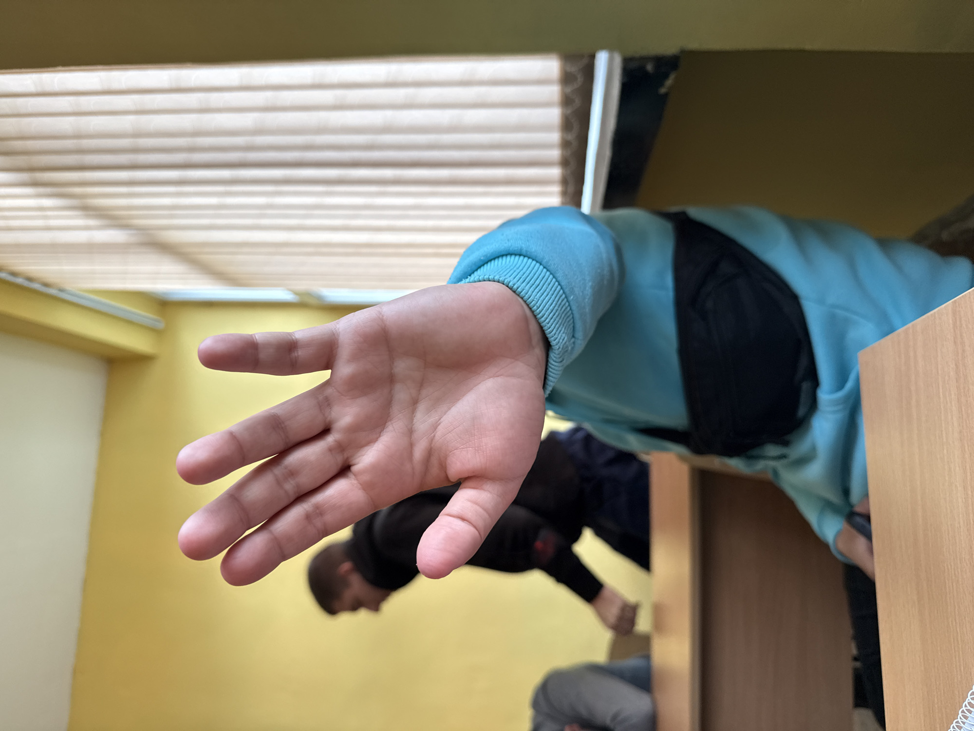 The image displays an indoor classroom scene in Cherven Bryag, Bulgaria. In the immediate foreground, a light-skinned hand, presumably belonging to the person holding the camera, is raised towards the lens, palm facing outward, obscuring a portion of the view. The individual wearing the blue sweatshirt also has a black fanny pack strapped across their torso. In the blurred mid-ground, a male individual with short dark hair walks from right to left in profile, wearing a dark hooded sweatshirt and dark trousers. Another person's arm, clad in a grey long-sleeved garment, is partially visible resting on a desk on the far left. The environment includes light brown wooden student desks, bright yellow walls, a white ceiling, and a large window on the right side fitted with vertical cream-colored blinds. A narrow, darker yellow-green vertical wall section is visible on the extreme right.