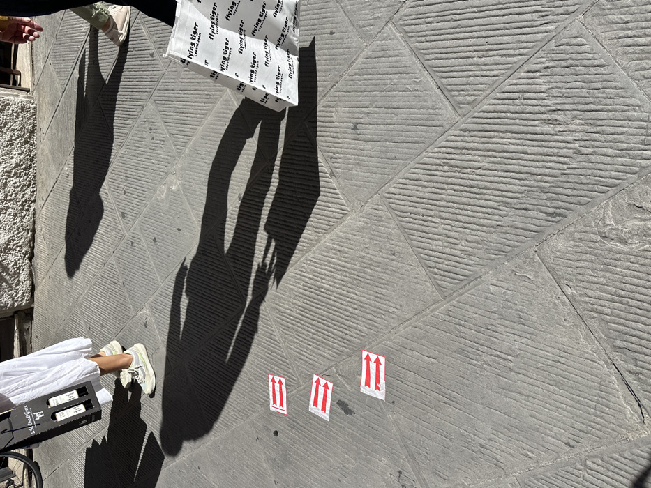 The image depicts a sunlit pedestrian thoroughfare in Siena, Italy, characterized by textured grey stone pavement laid in rectangular and square patterns, many blocks exhibiting parallel grooves. Three distinct, elongated human shadows are cast on the ground from a low sun angle. On the left side, the lower half of an individual is visible, wearing a white dress and light-colored athletic shoes with subtle green accents. This person carries a black cardboard wine carrier featuring the brand "Il Molino & Grace" and holding two bottles. On the right, the lower half of another individual is seen, clad in dark trousers and light-colored slip-on shoes, holding a white reusable shopping bag covered with the repeated "flying tiger copenhagen" logo. A prominent third human shadow dominates the central foreground, suggesting another person's presence just out of frame. Three identical white rectangular stickers, each containing two horizontal red arrows pointing to the right, are affixed to the pavement in a diagonal line, serving as directional indicators. A rough-hewn stone building facade is partially visible in the upper right background.