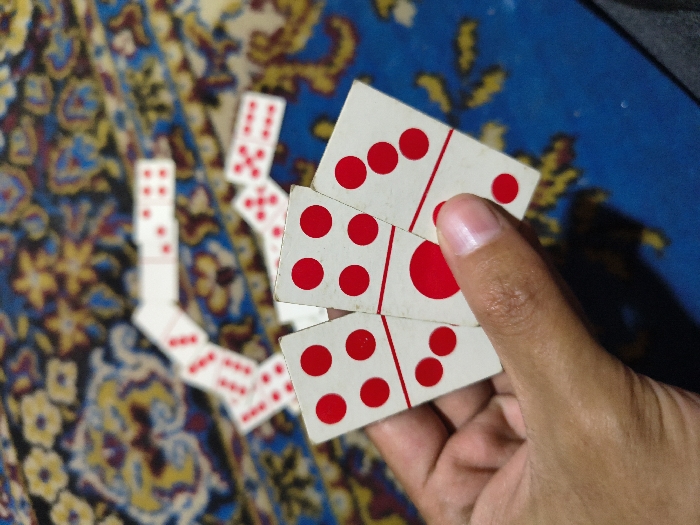 - "A hand holds three domino tiles against a backdrop of scattered dominoes and a patterned surface" by FM-gA4dL2, licensed under CC BY 4.0