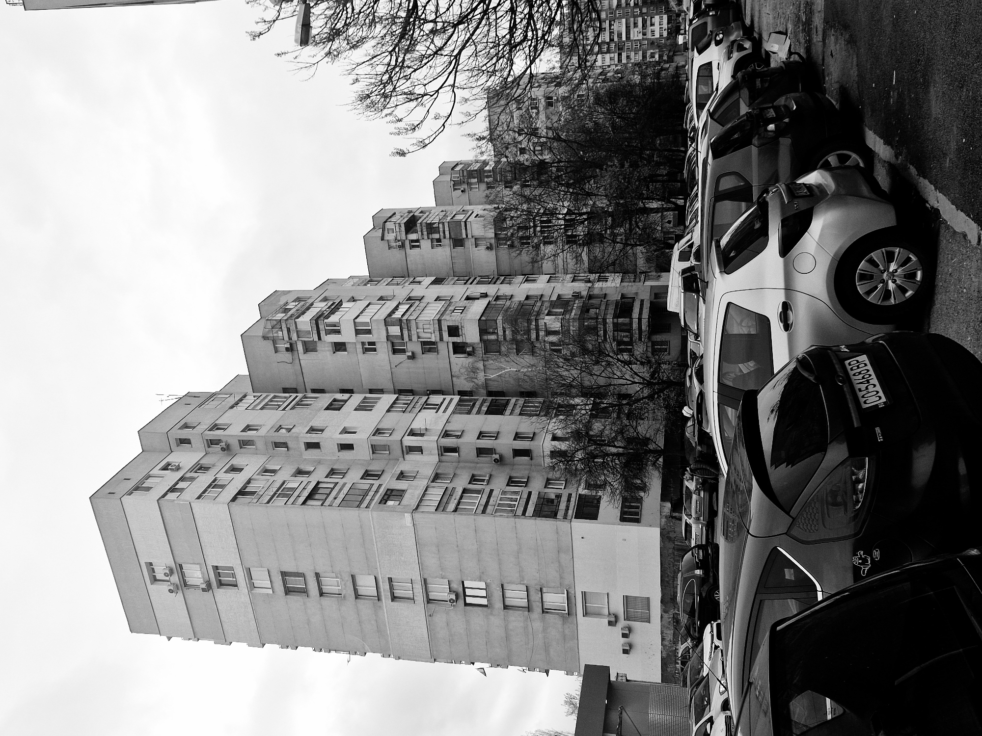 The image depicts a street in Sofia, Bulgaria. There are tall residential buildings with numerous windows and air conditioning units, set against a cloudy sky. Several cars are parked along the street. The cars partially obscure the buildings, and there are bare tree branches visible among the buildings. The photograph is in black and white, enhancing the starkness of the urban environment. A license plate on one of the cars is visible with the designation "CO5468BP."