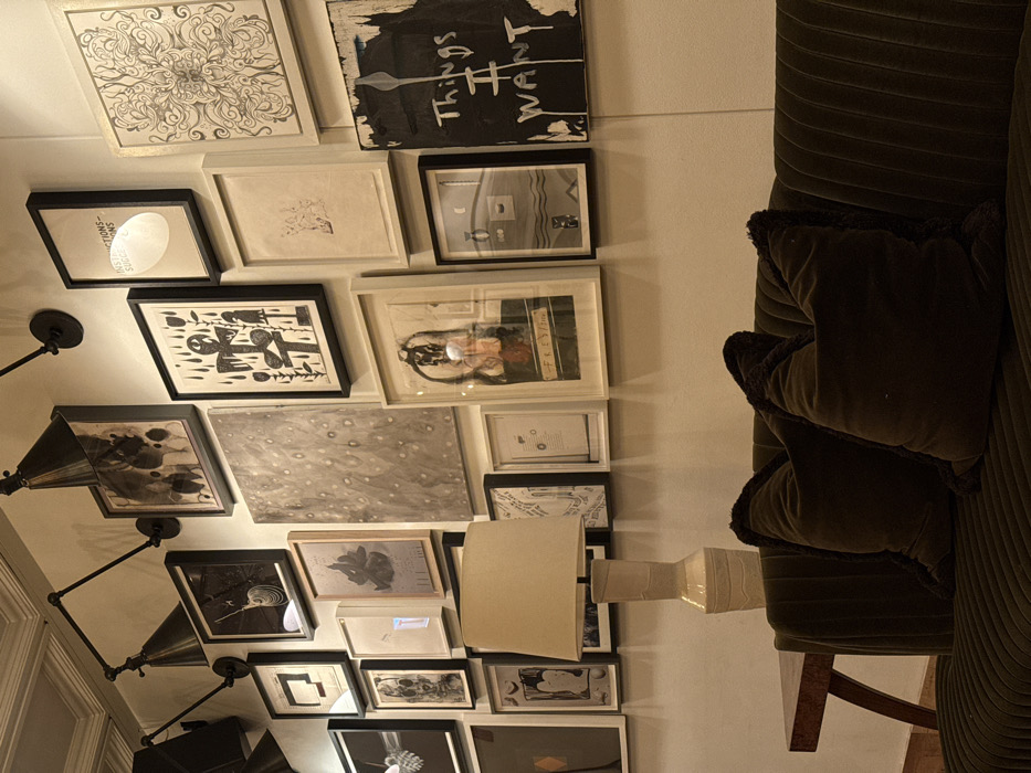 This image depicts an interior scene, likely a lounge or living area, located in the city of Unknown, Unknown. A light-colored wall is densely covered with approximately 25 to 30 framed artworks of varying sizes, orientations, and artistic styles, predominantly featuring monochrome or muted palettes. Visible artworks include abstract patterns, stylized figures, and textual pieces. Several black, articulated wall-mounted lamps with conical shades are positioned along the top of the wall, casting light downwards onto the displayed art. In the lower foreground, a dark olive-green velvet sofa with a ribbed texture is partially visible, featuring two large, dark brown velvet throw pillows with shaggy trim. A tall table lamp with a cream-colored fabric shade and a textured ceramic base stands on a dark wooden side table, positioned to the left of the sofa and partially obscuring some of the lower wall art. No individuals are present in the scene.