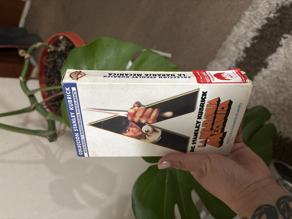 A person is holding a VHS tape of Stanley Kubrick's "A Clockwork Orange," in Spanish ("La Naranja Mecánica")