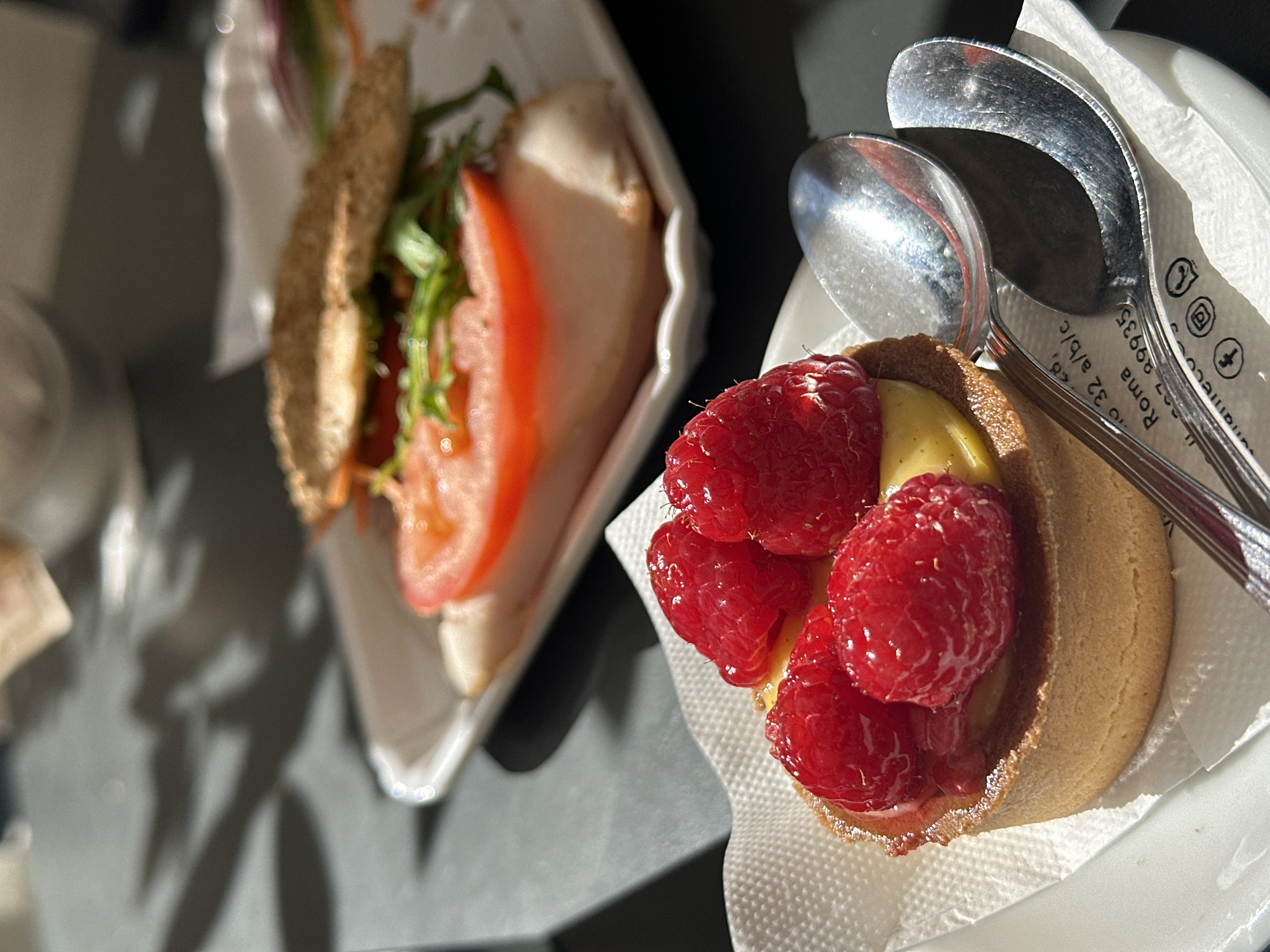 The scene depicts a tabletop setting in Rome, Italy, evidenced by the text "Roma" and the local phone number "06 297 99935" printed on a white paper napkin. The environment is illuminated by strong, directional sunlight, creating distinct shadows on the dark table surface. In the foreground, a single round raspberry tartlet is presented on a white saucer, positioned on the aforementioned white paper napkin. The tartlet consists of a light brown pastry crust, a visible yellow custard filling, and is topped with several whole, ripe red raspberries. Two silver spoons rest adjacent to the tartlet on the napkin. In the blurred background, a sandwich is visible on a white disposable plate. The sandwich appears to be constructed with whole wheat bread, several slices of light-colored meat (consistent with poultry), a prominent slice of red tomato, and green arugula leaves. No individuals are present within the photographic frame.