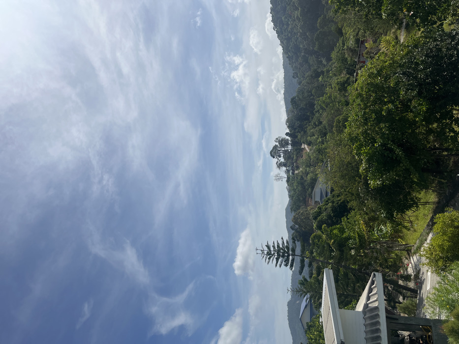 A vibrant daytime landscape showcases a lush, green hillside dotted with trees and structures. The sky above is a bright blue with wispy, scattered clouds. A tall, coniferous tree stands prominently in the foreground, partially obscuring a building's roof. The scene exudes tranquility, highlighting the natural beauty of the environment with the sky dominating the view.
