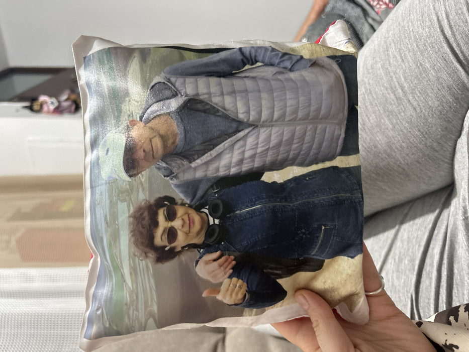 A photograph printed on a rectangular fabric item, resembling a small pillow, is held by a person's left hand