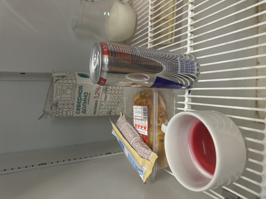 The image displays the interior of a white refrigerator, indicative of a domestic or office setting, located in Unknown, Russia. A wire rack shelf, showing minor discoloration and debris, holds several items. In the lower left foreground, a white ceramic mug contains a small volume of dark red liquid. Adjacent and to its right, a silver Red Bull energy drink can, marked "0.35л" and featuring Cyrillic text, stands upright. Directly behind the mug and can, a clear plastic container encloses a golden-brown food item, possibly a pastry, topped by a retail label and two wrapped snack bars (one blue/white, one beige/red). In the upper right background, an open "Северная долина" (Severnaya Dolina) brand milk carton, advertising 3.2% milk, is visible alongside a clear glass pitcher containing white liquid, presumably milk. No individuals, active interactions, or explicit actions are present in the scene.
