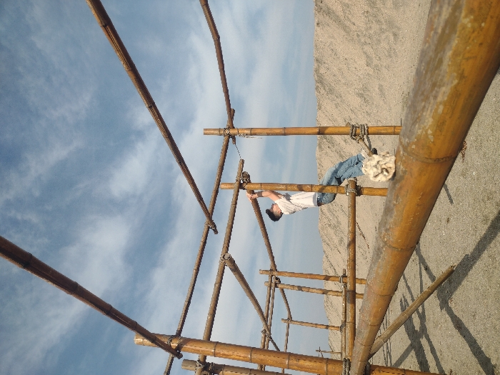 The scene depicts a male individual performing an acrobatic maneuver on a bamboo structure in a sandy, outdoor environment
