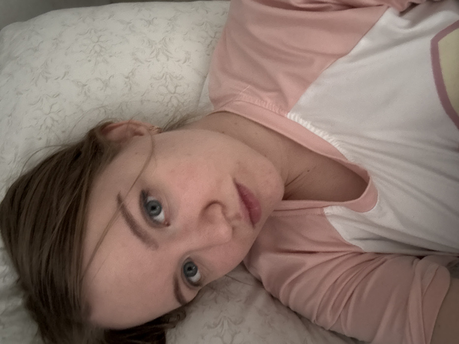 An overhead medium close-up shot captures a young adult female lying on her back in an indoor setting within Nizhnekamsk, Russia. The individual has fair skin, light brown hair, and blue eyes, looking directly into the camera with a neutral expression. Her hair is casually styled, with strands across her forehead. A small, gold-colored hoop earring is visible in her right earlobe. She wears a short-sleeved top with pink raglan sleeves and a white body. Her head rests on a light-colored pillow adorned with a repeating floral or leaf pattern.