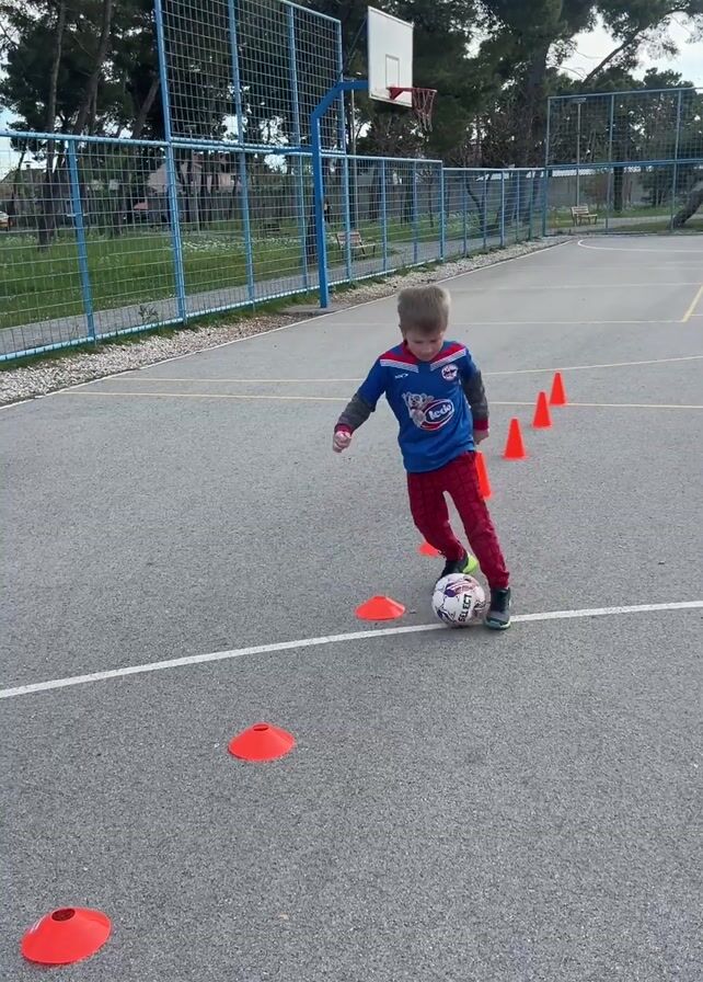 A young boy is practicing soccer drills on an outdoor court