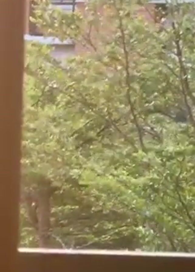 A stationary view from inside a building, possibly a room, looking out through a window
