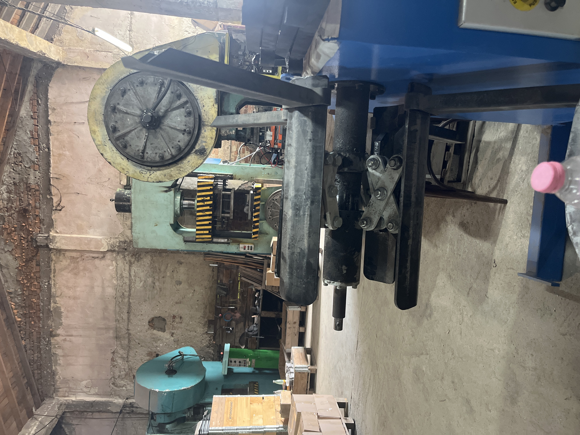 cluttered workshop environment in Balgarevo, Bulgaria. The foreground is dominated by industrial machinery, including a blue metal structure, and large, possibly hydraulic, pistons. The background is filled with older, green and yellow machinery, suggesting a history of industrial activity. The workshop itself is in a state of disrepair with exposed brick and uneven plaster. Wooden crates and boxes are scattered around. No people are visible in the image.