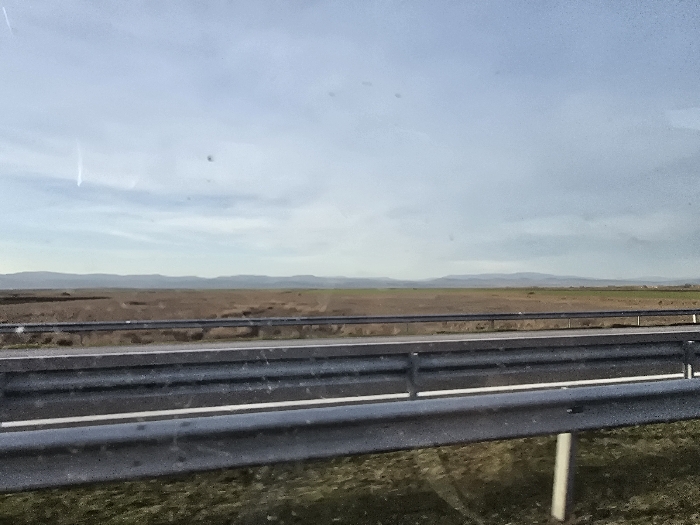 The image presents a panoramic view of a rural highway landscape, identified as being near the city of Загорци, Bulgaria, likely captured from inside a moving vehicle. In the foreground, a prominent grey metallic guardrail extends horizontally across the lower portion of the frame, with reflections or smudges visible on the transparent surface it is viewed through. Below the guardrail, a strip of sparse, brown and green vegetation is present. Behind the guardrail, a paved two-lane road or highway stretches across the midground, marked by a solid white line. Further back, a smaller metallic barrier runs parallel to the highway. Beyond the road infrastructure, a wide, flat expanse of brown, fallow land dominates, interspersed with occasional patches of green vegetation. In the distant background, a low range of hills or mountains is visible against a mostly clear, light blue sky featuring scattered white clouds and faint contrails in the upper left quadrant. There are no people, animals, specific actions, or direct interactions discernible within the frame.