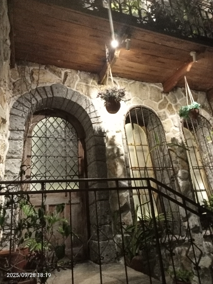 This image depicts a nighttime or interior architectural scene in Waso ward, Kenya, characterized by rustic stone masonry and wooden structural elements. The foreground features a black metal railing with a decorative pattern, positioned diagonally from the lower left to the middle right, suggesting a staircase or balcony. Behind this railing, multiple green potted plants are visible at ground level. The primary architectural features are irregular, light-colored stone walls forming several arched openings. The leftmost arch frames a window or door secured with a diamond-patterned metal grille. To the right, two additional arches frame windows fitted with vertical metal bars. Above, a wooden ceiling, composed of horizontal planks, spans the width of the frame. A single, downward-facing light fixture is centrally suspended from this wooden structure, illuminating the area below. Two dark-colored hanging planters, each containing foliage (one lighter-toned, one green), are also suspended from the wooden ceiling. No individuals are present in the scene. A digital timestamp "2025/09/28 18:19" is visible in the lower left corner.