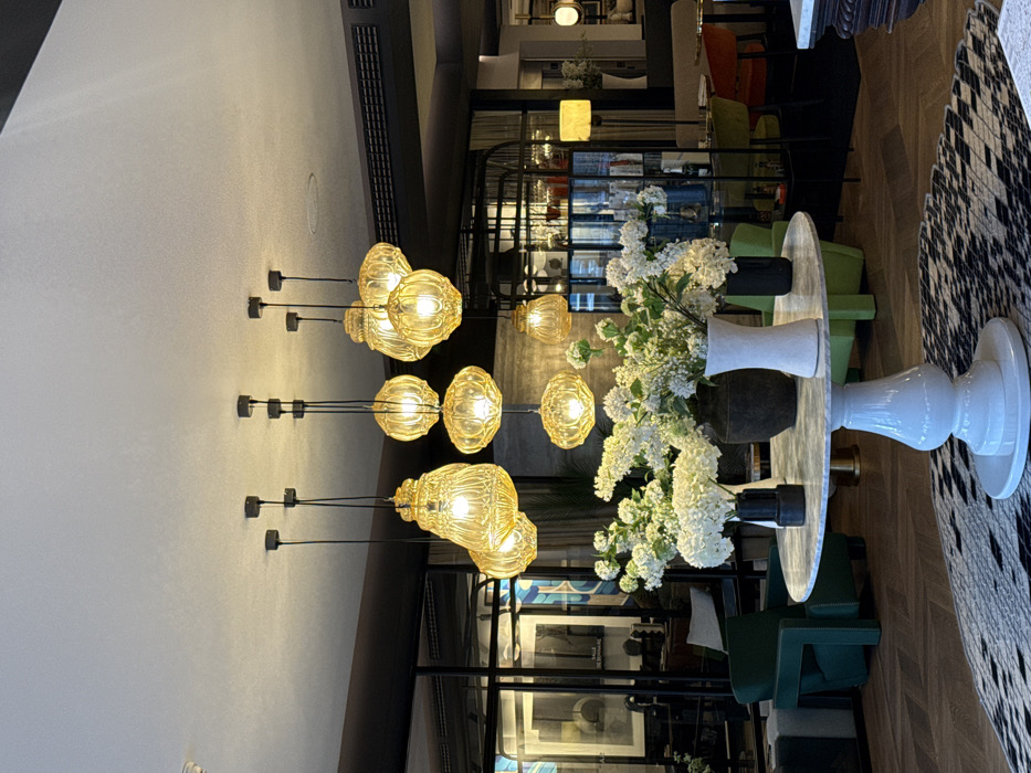 This image captures the interior of a lounge or lobby area within the Renaissance Bordeaux Hotel, located in Bordeaux, France. The foreground is dominated by a round table with a white marble top and a prominent white, sculptural pedestal base, situated on a black and white geometric patterned rug. Three floral arrangements, each containing abundant white flowers (e.g., hydrangeas, lilacs), are placed on this table in dark gray/black and white vases of various designs. Above the central table, a cluster of approximately thirteen hanging pendant lights with ribbed, translucent amber-yellow glass shades illuminates the space. These lights are suspended from the light-colored ceiling and display a variety of shapes, including globular, elongated, and flattened forms. In the mid-ground, a dark green upholstered armchair is visible to the left of the central table, and a lighter green armchair is partially visible to the right. The background features dark-framed glass partitions that delineate distinct areas. Through the partition on the left, framed artworks are visible, with one containing the text "SALLE DE REUNION" (Meeting Room). To the right, another glass partition reveals a tall, black metal shelving unit, possibly a bar or display, stocked with bottles and glassware. A floor lamp with a rectangular, cream-colored shade stands further back on the right. Additional seating arrangements, including tables with various colored chairs (e.g., green, orange-red), are discernible in the deeper background, suggesting a restaurant or bar section. The visible flooring not covered by the rug consists of herringbone-patterned wood planks. No individuals are present within the frame.