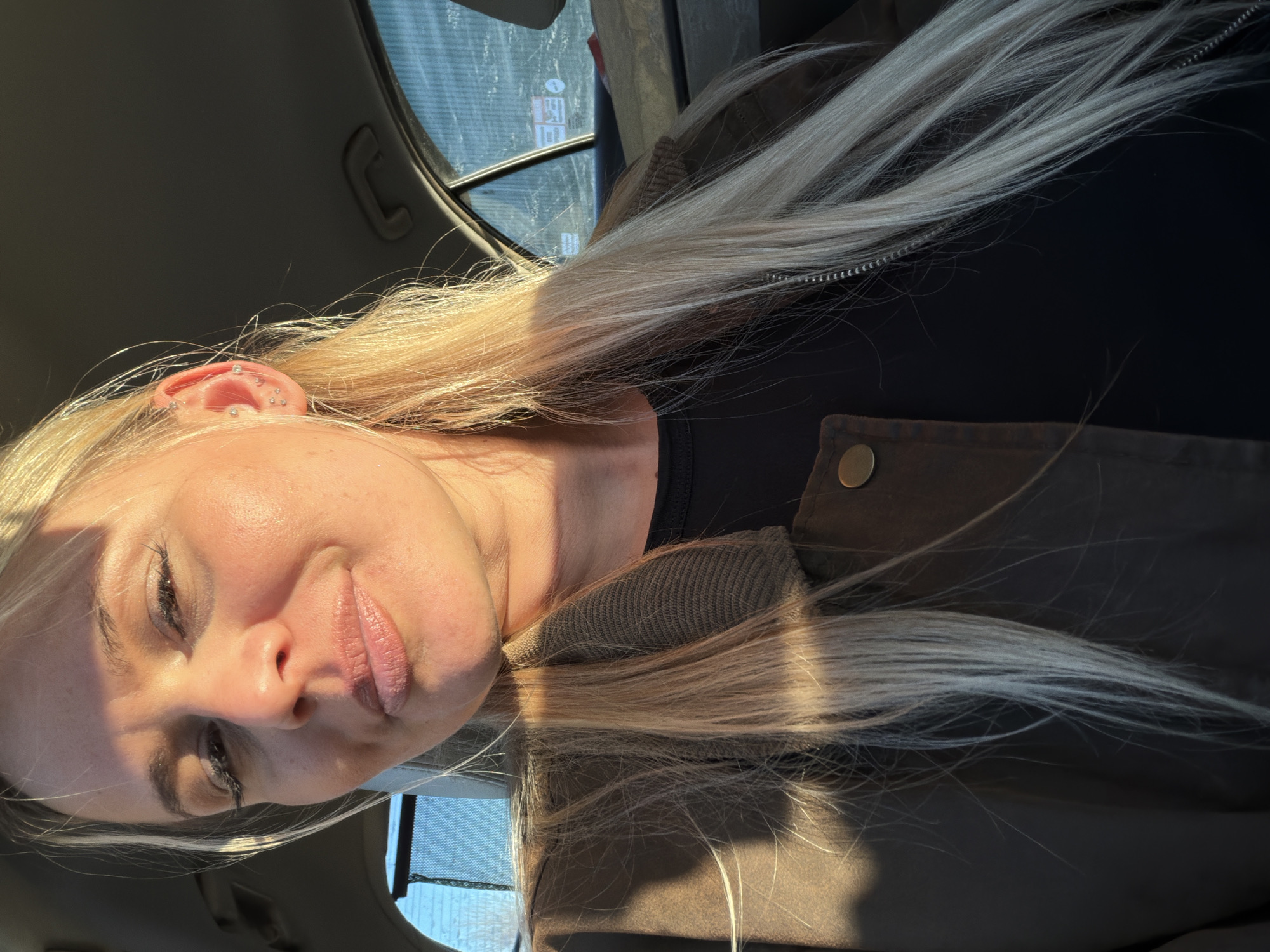 The scene is set within the passenger compartment of a vehicle in the city of Sarapul, Russia. The image features a close-up portrait of an individual, appearing female, with long blonde hair and fair skin. Her face is illuminated by strong, warm sunlight from the left, casting a distinct shadow across the right side of her nose and cheek. Her eyes are partially closed, and her lips are slightly parted in a subtle, upward curve. Dark eyelashes are visible. The subject's right ear, exposed on the right side of the frame, displays multiple piercings, including at least five small, silver-colored stud earrings across the lobe and helix. She is wearing a dark, possibly black, undershirt beneath a brown or olive-green jacket. The jacket features a ribbed collar, a visible brass-colored snap button on the lapel, and a partially visible zipper. In the background, elements of the vehicle's interior are discernible, including a dark headliner with a light-colored grab handle above the subject's right shoulder and a rear window exhibiting a light blue hue, indicative of the sky or distant exterior environment.