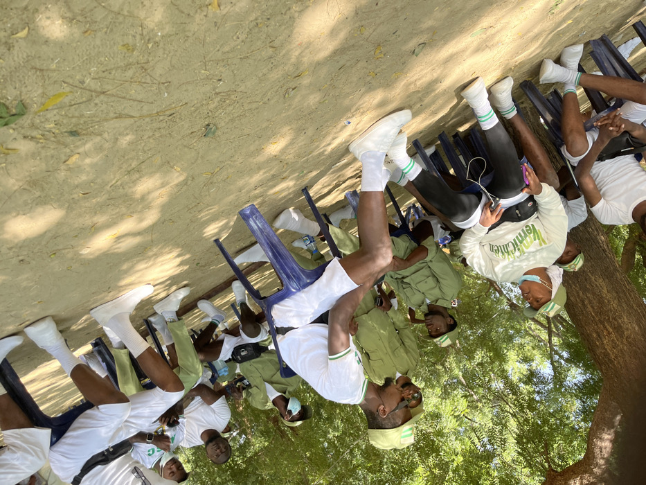 An outdoor gathering in Maiduguri, Nigeria, depicts approximately ten to twelve individuals, predominantly young adults, seated on blue plastic chairs under the shade of trees. The ground is light brown earth with sparse fallen leaves, illuminated by natural daylight. The individuals are primarily wearing components of the National Youth Service Corps (NYSC) uniform. Several wear full khaki shirts and trousers, paired with light green caps featuring white stripes and a crest. Others wear white short-sleeved shirts, white shorts, white ankle socks with green stripes, and white sneakers or shoes, also topped with the distinctive green and white NYSC caps. One female individual is notable in a light green long-sleeved shirt with "Vernichter" printed on the chest, black leggings, white shorts, white socks with green stripes, white shoes, and an NYSC cap, also wearing a black fanny pack. All individuals are seated, generally facing towards the right side of the frame. Some are observed holding mobile phones. Plastic water bottles are visible near the feet of several seated individuals. The group appears to be at rest or engaged in an observational capacity within the shaded environment.