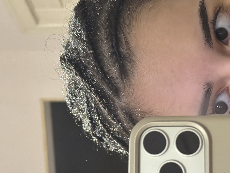 A close-up shot captures a person's reflection in a mirror. The focus is on their face, particularly the eyes and hairline. Braided hair, glistening with what appears to be water droplets or glitter, is visible along the forehead. A portion of a smartphone is in the lower right corner of the frame, partially obscuring the reflection. The background is blurred, suggesting an indoor setting.