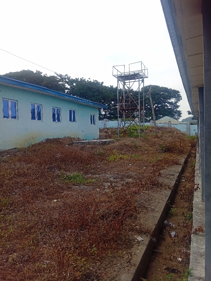 The image displays an outdoor scene in Okengwe - Obehira, Nigeria. On the left, a single-story building with light blue walls and a dark blue roof is visible, featuring multiple rectangular windows with reflective blue panes. In the central mid-ground, a tall, rusted metal structure, resembling a water tower or observation platform with a square platform at its apex, stands prominently. The ground between the light blue building and the right edge of the frame is covered by an extensive area of dry, brown, overgrown vegetation. Along the far right, a partial view of a beige architectural overhang and dark supporting pillars suggests another building or covered walkway. A concrete drainage channel runs parallel to this structure, containing visible litter, including plastic bottles. Green trees form a dense backdrop behind the light blue building and the metal tower. The sky is overcast and uniformly light. No individuals or active subjects are present in the scene.