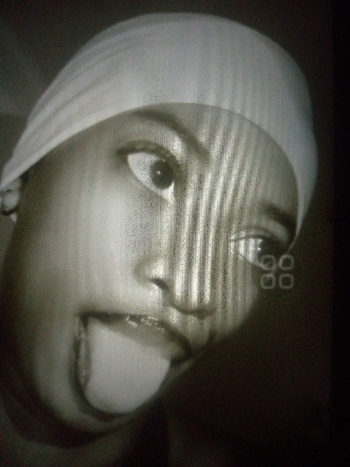 A close-up black and white portrait shows a person wearing a white head covering. They have one eye wide open and the other slightly closed. Their tongue is sticking out. An earring is visible. The image appears to be taken from a low angle and has a grainy texture. There is an unclear pattern near the right eye.