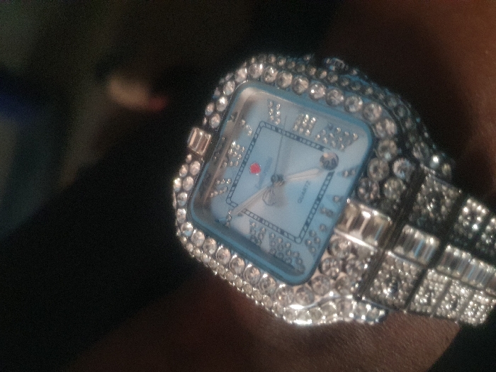 A glitzy watch features a square face with a light blue background and silver detailing. The bezel and band are heavily adorned with sparkling crystals of varying sizes and shapes, giving it a luxurious and extravagant look. The watch appears to be worn on a dark-skinned person's wrist, partially visible against a dark background. The overall aesthetic suggests a statement piece.
