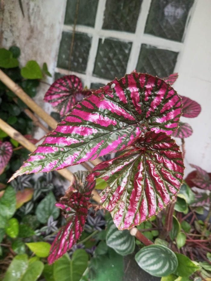 The image captures a close-up, eye-level view of a plant featuring large, variegated leaves. The predominant leaves display a distinct pattern of vibrant fuchsia pink and dark green stripes, with a textured, slightly corrugated surface and serrated edges. One leaf in the upper center exhibits a small circular perforation near its edge. Other smaller leaves of the same species are visible, along with various background foliage in shades of green, including a plant with round, green and silver-striped leaves in the lower right. A light brown, cylindrical object, possibly a bamboo cane, is visible diagonally behind the primary plant. The background consists of a light-colored wall, presumed white or off-white, containing a window composed of multiple translucent or frosted glass blocks arranged in a grid pattern. No individuals or specific actions are depicted. The scene is located in the city of Pandaria, India.