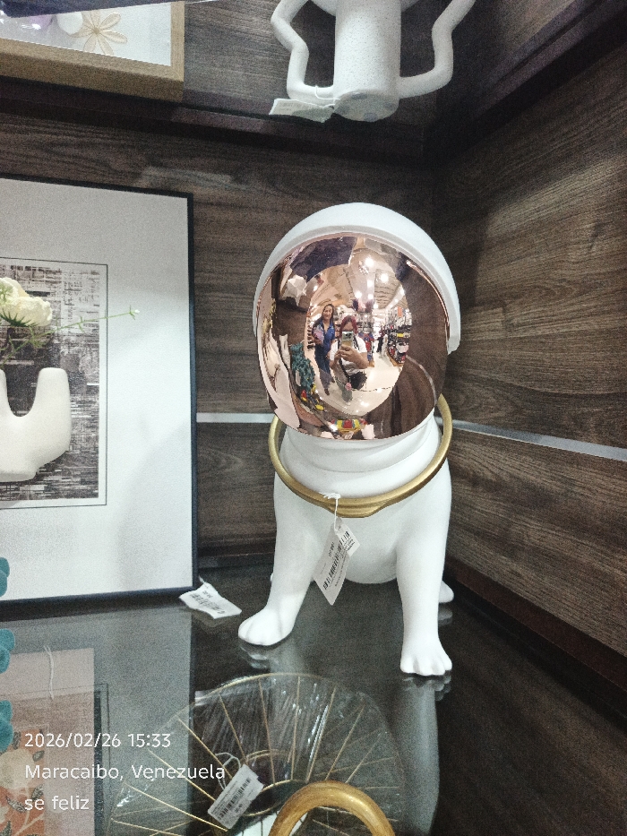 An indoor scene in Maracaibo, Venezuela, captures a white figurine resembling a bulldog wearing a white astronaut helmet with a rose-gold, highly reflective visor. The figurine has a golden ring collar from which a white price tag hangs. The figurine rests on a dark, reflective surface, likely glass, which shows partial reflections of items below, including a gold-colored wire decorative object. The reflective visor of the figurine clearly mirrors the interior of a retail establishment. Two individuals are reflected: one on the right (from the viewer's perspective) is actively holding a smartphone, capturing the reflection, and has reddish-brown hair. The second individual, positioned to the left, has darker hair and is wearing a blue top. The background within the reflection shows multiple aisles of a brightly lit store, featuring various products displayed on shelves and racks, indicating a commercial setting. To the immediate left and behind the figurine, a framed artwork with a black frame, white mat, and a monochromatic abstract print is visible. In front of this artwork, a white, irregularly shaped vase holds light-colored artificial flowers. Above the main figurine, a white, textured, abstract decorative object is partially visible against a dark brown wood-grain background, consistent with shelving. A digital timestamp and location "2026/02/26 15:33 Maracaibo, Venezuela" are overlaid in the lower-left corner of the image, along with the Spanish phrase "se feliz."