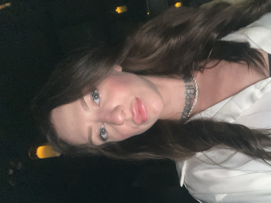 A woman poses in a low-lit environment, possibly at night. She has long, dark hair, fair skin, and light eyes. Her lips are slightly puckered. She is wearing a white shirt. A silver chain adorns her neck, partially obscured by her hair. A tattoo in a Slavic language is visible on her neck. The image is rotated slightly, and the background is mostly dark.