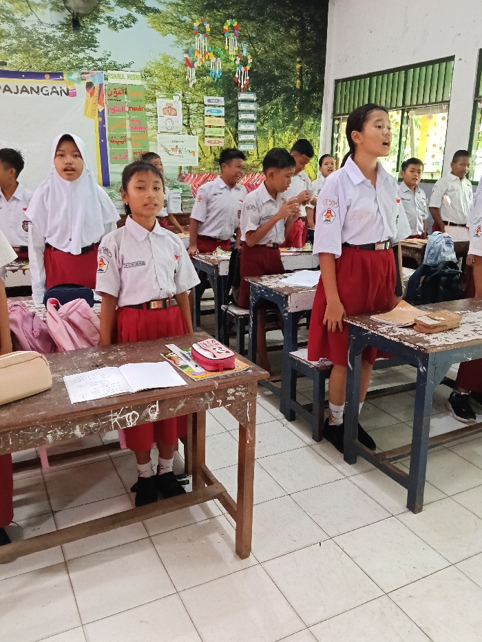 A classroom scene shows a group of schoolchildren in matching uniforms, consisting of white shirts and red bottoms. The children are standing at their desks. Some are wearing headscarves. A backdrop of a colorful classroom setting includes a wall chart and decorative hanging ornaments. The students are possibly singing or speaking in unison.